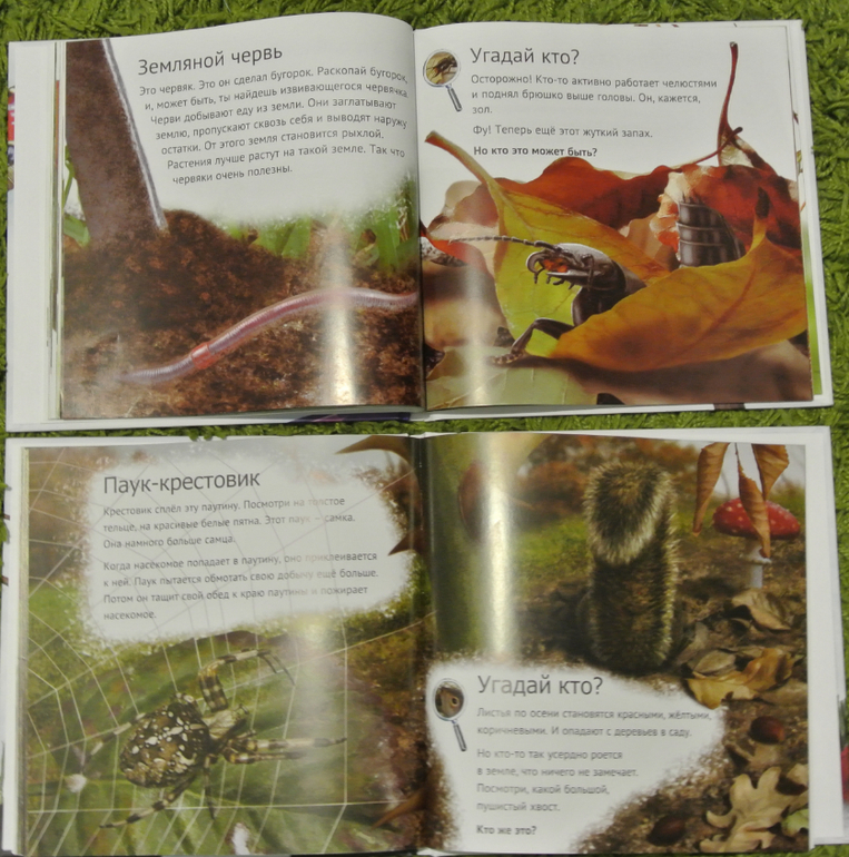Кто живет у нас на даче. Букашки - т.к. я читала мальчишкам в июле книги о насекомых, то и сын поглядывал в свои "Букашки". Ему нравятся макро фото в книге. Плюс стиль изложения в виде игры. Вопрос с подсказкой и ответ с небольшим описанием.
