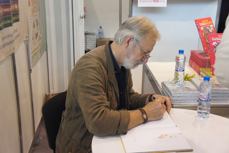 Еще сказал, что совсем не жалеет что приехал (а ведь он всего на несколько часов в Москву приехал, для автограф-сессии только. И поезд так рано (в 17.45) потому, что у его жены на следующий день ДР, и ему нужно еще успеть вечером с поезда доехать до дачи).