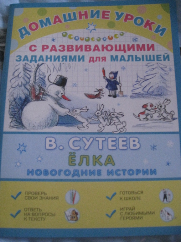 5) Домашние уроки с развивающими заданиями для малышей. Пособий тоже несколько в серии, и новогодние, и не очень. Сутеев, и этим всё сказано))) Сначала рассказ про елку ( к сожалению, не помню, как назывался соответствующий мультфильм), затем несколько страничек с "домашними уроками": раскрась по схеме, отыщи героев, дорисуй, найди. Заданий буквально 6-7, то есть меньшая часть книги. В основном всё-таки повествование с отличными иллюстрациями.