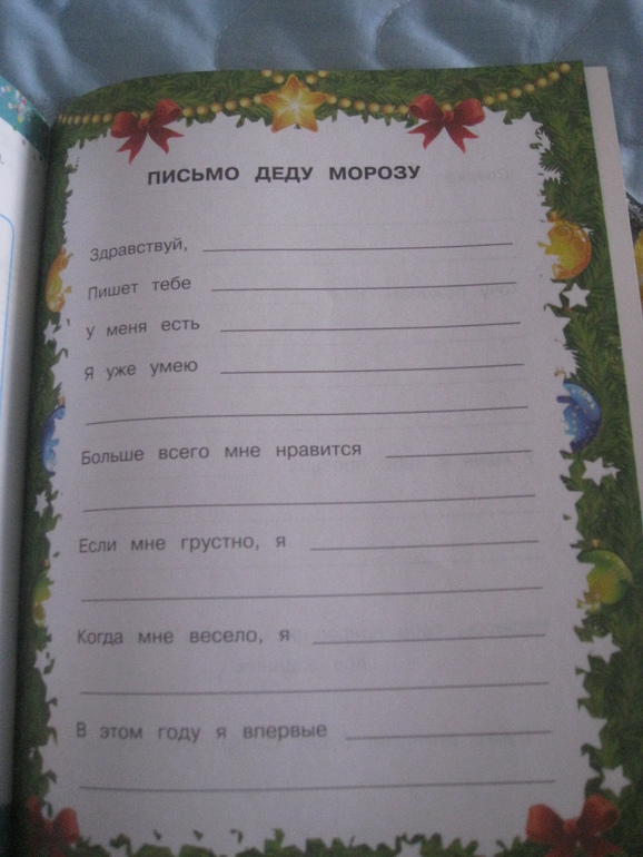 В серии несколько книг, все на офсете, цветные, с твердой вкладкой и наклейками. Задания в чем-то схожи. Здесь очень понравилось, что на первом же развороте разговор о времени - сколько раз в России наступает НГ - интересно и полезно. Дальше задания на счет, раскраски, дорисуй по образцу, прописи, лабиринты. На последней странице традиционное письмо ДМ. На твердой вкладке планеты - материал для изготовления поделки. Во многих заданиях предполагается использование наклеек - они здесь же. Всего 32 страницы. Честно говоря, покупала книгу в подарок. Но ребенок увидел и отобрал))). Не удержалась и заказала второй вариант из этой же серии.