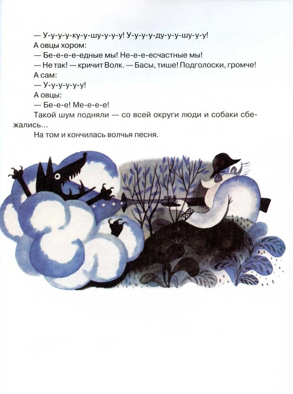 - Прибежали люди, увидели волка, который к овцам подобрался и убили его из ружья. Так и закончилась волчья песня... (вариант в книге для более старших деток, которые могут понять, почему же закончилась эта песня без подробностей).