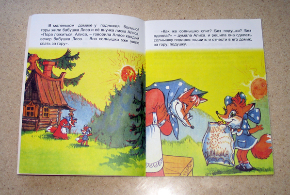 "Подушка для солнышка" - это сказка о маленькой лисичке Алисе, которая живет с бабушкой Лисой и которая очень переживала, что солнышко спит без подушки. В итоге она сделала подушку и решила подарить солнышку и отправилась на его поиски. По дороге она подружилась с зайчонком и медвежонком.