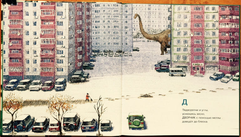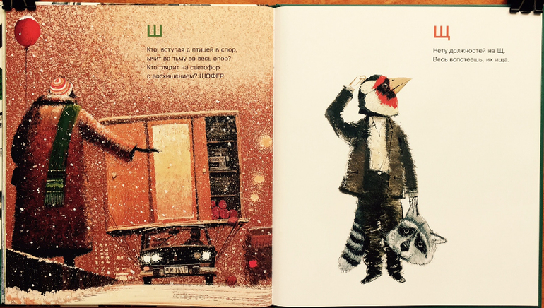 На каждой странице - одна буква алфавита и четверостишие о профессии, начинающейся с этой буквы. На самом деле, на несколько букв профессий не нашлось: "Нету должностей на Щ, Весь вспотеешь, их ища".