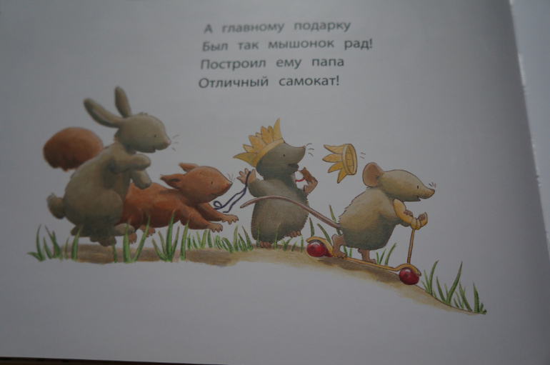День рождения удался! Все радостно уплетали торт, а мышонок получил много подарков. Но самый главный подарок был самокат. который папа сам придумал и смастерил.