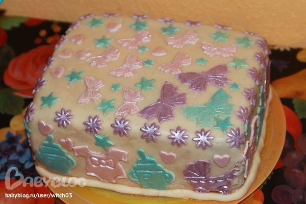 Проба пераДевочки! Насмотрелась я на ваши ШЕДЕВРЫ и вдохновилась научиться творить нечто подобное! Хочу к февралю более менее приличный торт сотворить :) У дочки годик будет. Ну а пока первая репетиция на 9 месяцев:) Торт шоколад на кипятке и крем Маскарпоне. (спасибо за рецепт Ольге!!!! очень-очень вкусно!!!!) Времени на украшение было ооочень мало, как и самой мастики... И краски только такие пока. Ну получилось то что получилось!!! Ну вот он! Критика приветствуется :)