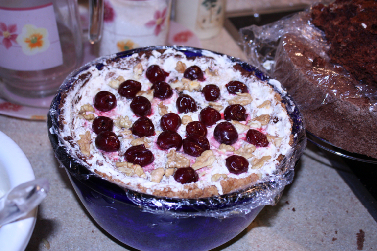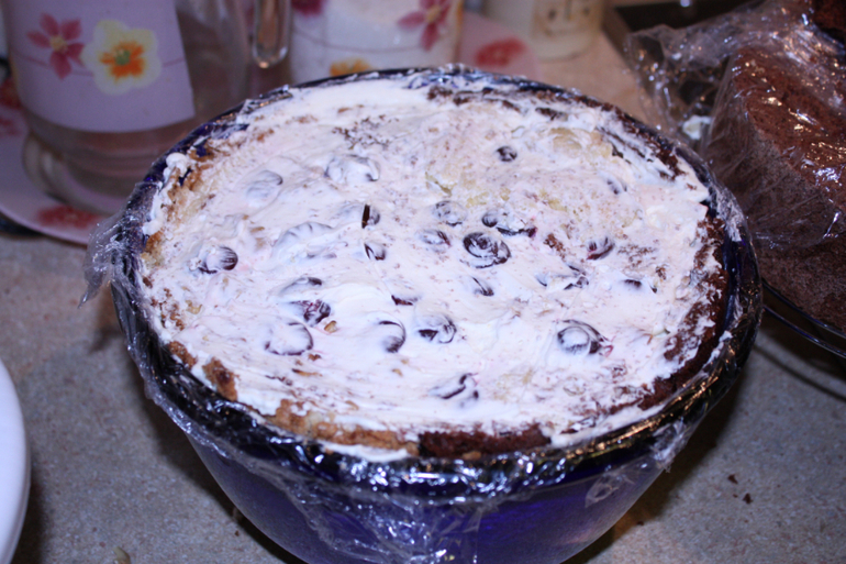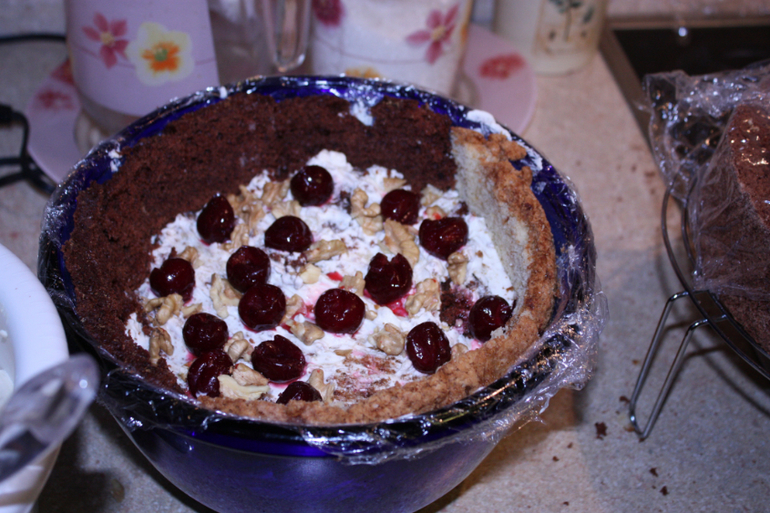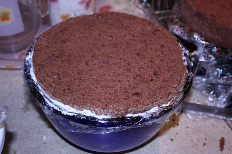 4. Выкладываем плотно кусочками начинку Панчо до верха чаши и прижимаем вторым коржом. Корж пропитываем ( у меня был сливочный ликер).