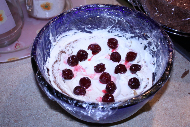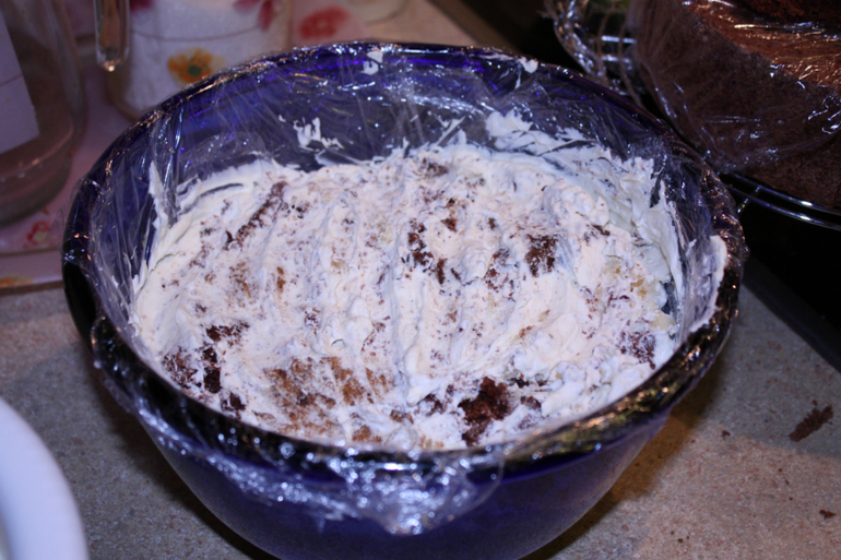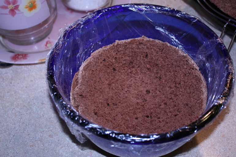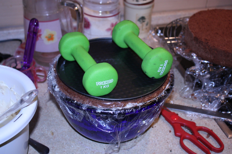 5. Корж покрываем пищевой пленкой и ставим торт под пресс в холодильник. Я тортировала в ночь, и утром приступила к дальнейшему процессу.