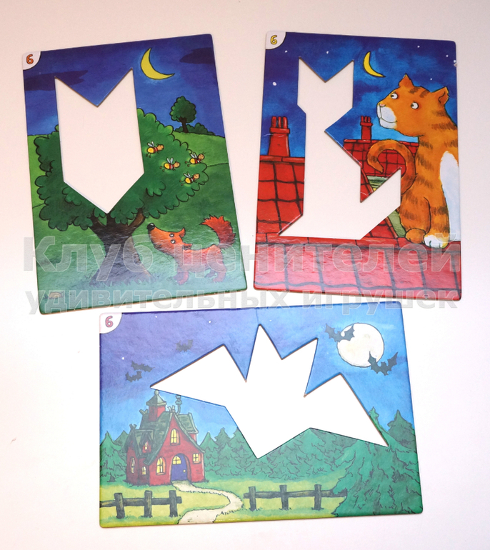 Три карточки более сложно уровня - здесь придется составить фигуру из 5 деталей.