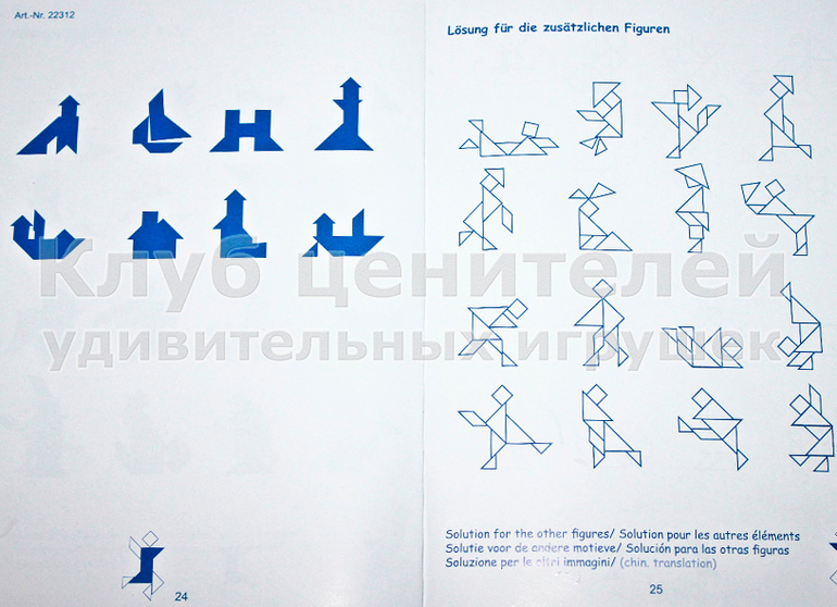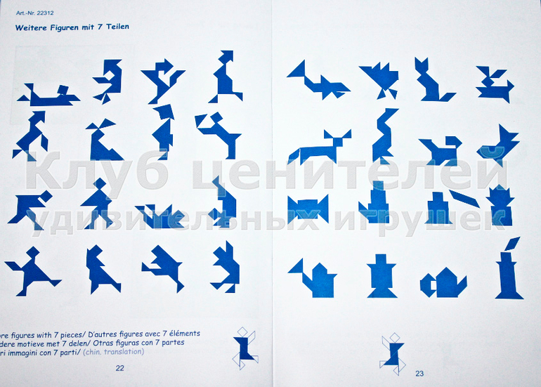 Еще в инструкции, кроме подсказок к заданиям с карточками, есть несколько схем для игры по классическим правилам - каждая фигура должна складываться из семи частей танграма, и при этом они не должны перекрываться.