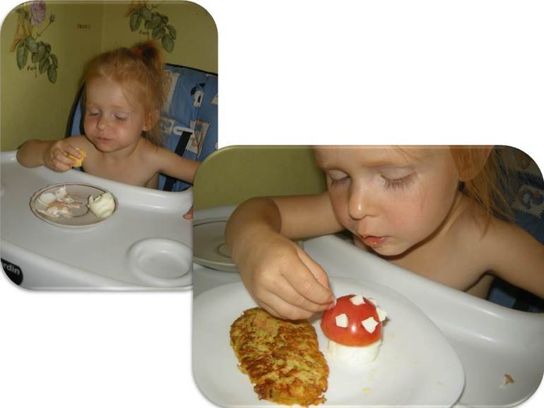 Начали с вкусного грибочка, пока я пошла за фотоаппаратом, Вика уже выбрала себе желток и начала кушать))