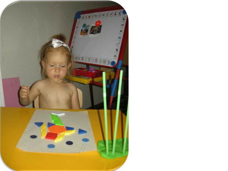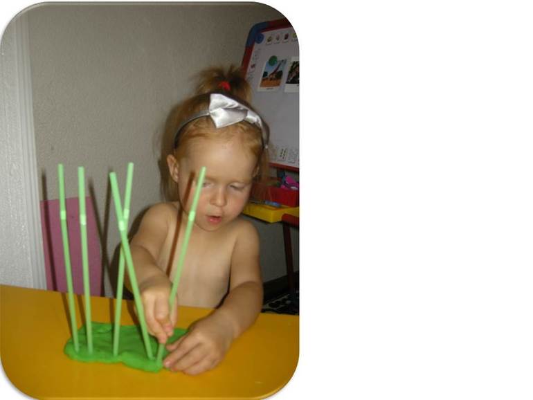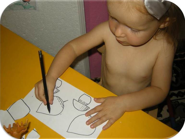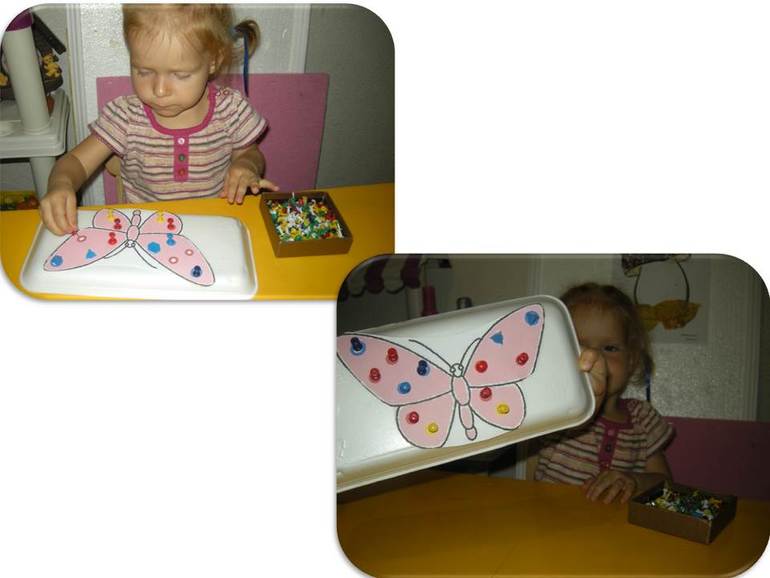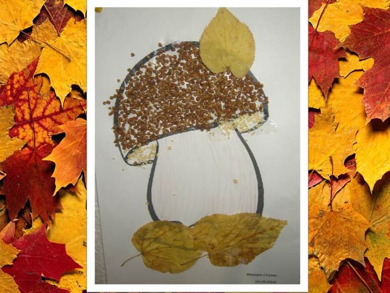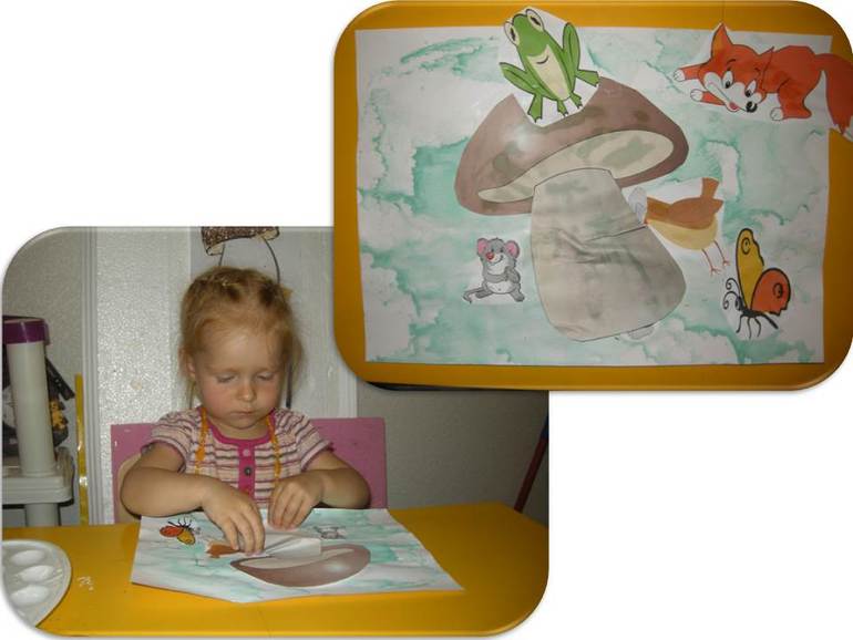 И сделала Вика аппликацию, сверху посадила гриб и потом жабу.