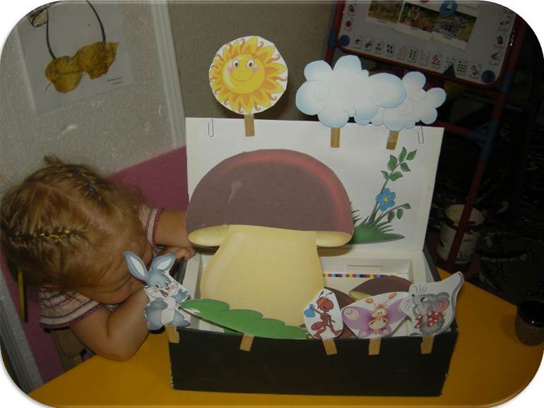 Вот как выглядит собранным. Также поиграли с грибами, повторили маленький/огромный/средний, поговорили, что когда идет дождь, грибочки быстро растут.