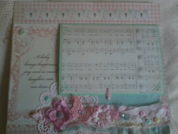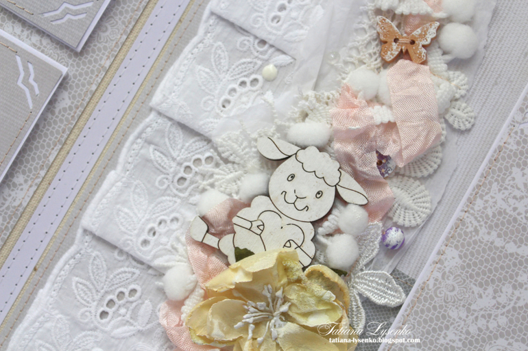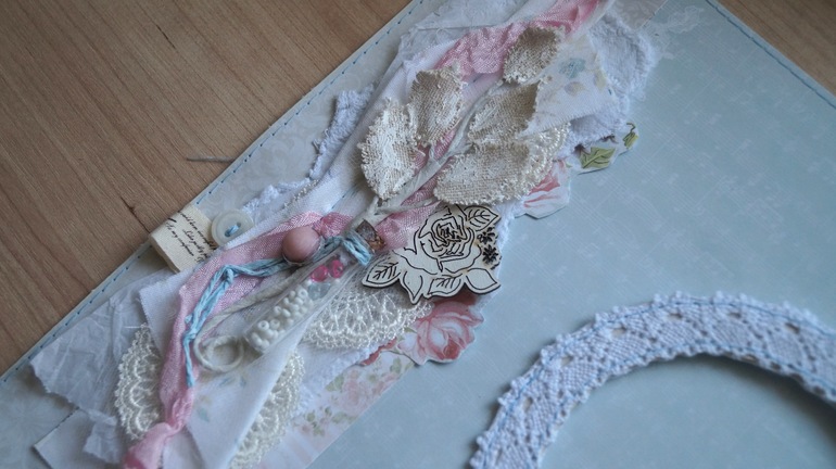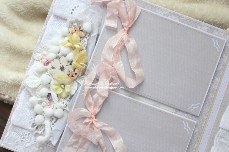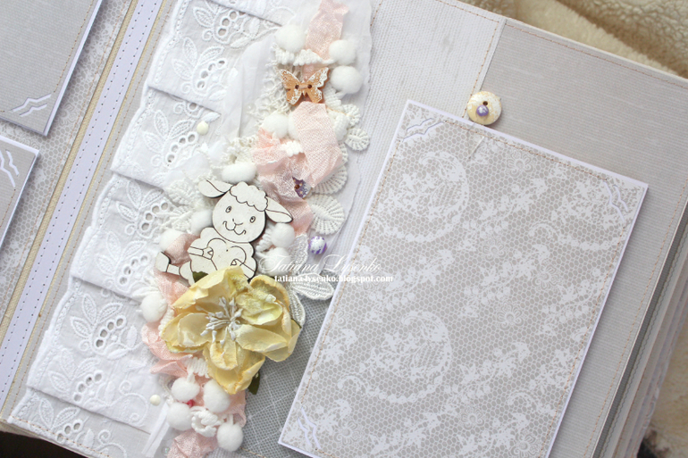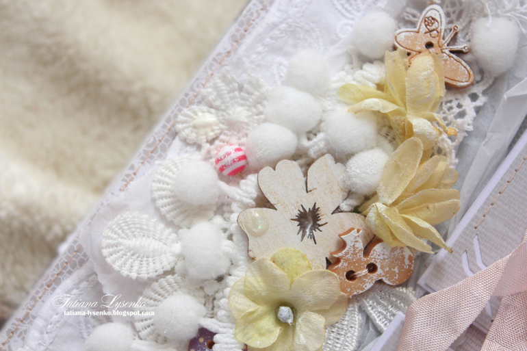 - ОЭ первого разворота - многослойность. В вашем развороте должно быть не менее 5-ти слоев из которых 2 обязательно должны быть текстильными. В моем развороте всего 9 слоев из которых 4 слоя из коллекции бумаги+1 слой прошвы+1 слой бумаги тишью+1 слой кружева+1 слой фигурной ленты pom-pom+1 слой шебби-ленты. Прошу заметить, что один белый текстильный цветок я за слой не считаю.
