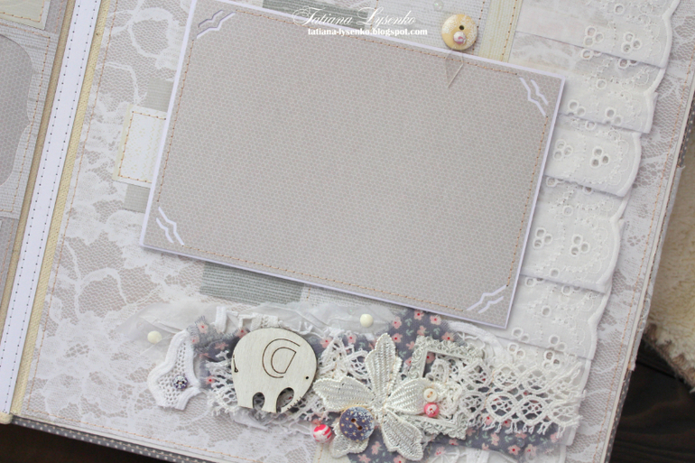 - ОЭ второго разворота - пуговичка. Пришивайте их, пожалуйста. Этот факт добавит еще большей нежности и воздушности вашим разворотам ;) У меня на развороте 10 пришитых пуговички: 7 пуговичек-mini, 2 бусины, 1 цветная деревянная круглая пуговица
