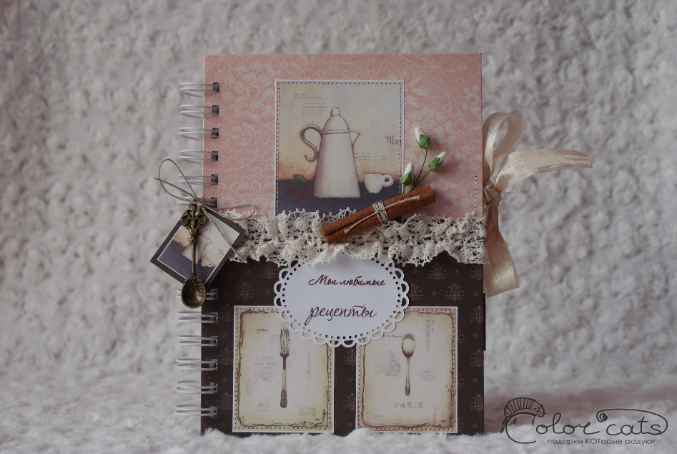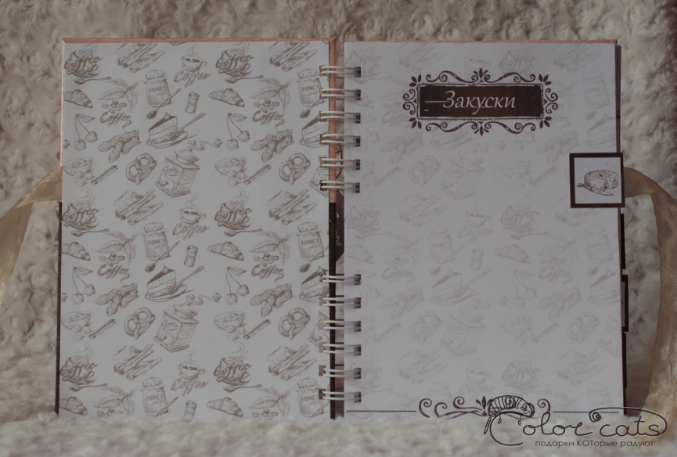 Всем привет) Я снова с кулинарной книгой. Сделана на заказ для девушки Натальи с ЯМ. Сделана по мотивам одной из моих кулинарных книг. У Натальи было пожелание - сделать надпиь на обложке - "Мои любимые рецепты". А в остальном - все как всегда. Формат А5, 4 вкусных раздела: "Закуски", "Горячее", "Десерт" и "Разное". Внутри 200 линованных страничек.
