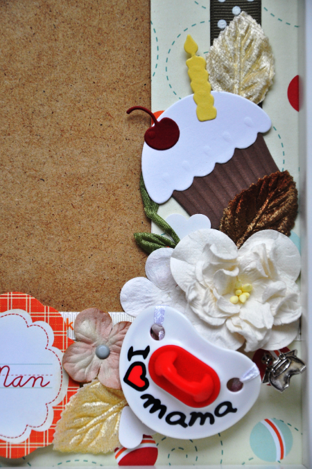 Бумага Космо Крикет Силли Сэм, тесьма с буквами ( опять же на фото отклеилась, подстава какая-то))), цветочки, вырубка кексик и вишенки к нему, брадс, "надпись" все из того же КК листа, рафия, ключик чипбордовский, подвеска с костюмчиком, всякая ерунда по мелочи)