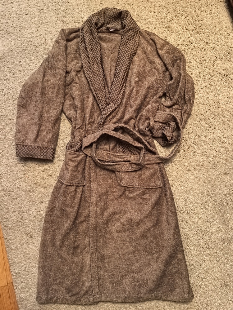 Халат махровый, думаю до 52 размера (на бирке L). Унисекс как по мне) приятный цвет молочного шоколада. Есть зацепки, но махровые вещи без них никак 😒 экв 1500