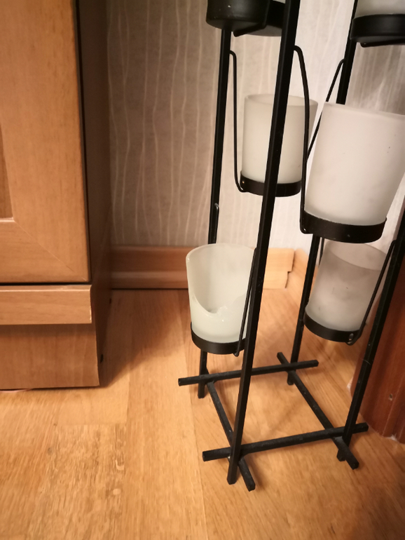 Интерьерный подсвечник, металлический. Высота около 75 см. Есть недостатки. 1. Следы от воска в стаканчиках. 2. Не хватает одного стакана, но в общей картине в глаза не бросается. 3. Один стакан разбит (второе фото). Тоже в глаза не бросается, если разбитым местом к стене повернуть. Ну или снять вообще его можно, они все съемные. Покупали в Красном кубе. Цену точную не помню, но что-то дороговато было ) Мой экв 2500 (условный)