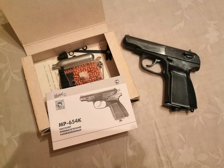 Пневматический пистолет МР-654К. Меняю со всем, что на фото - какие-то мелкие резиновые комплектующие, насадка на баллон, ключ, 1 баллон и полная коробка шариков (штук 200-300 наверное, может больше). Баллон давно лежит, не знаю есть у них срок годности или нет, просто предупреждаю. В инете цены в диапазоне 7-9 тыс. Экв 6000