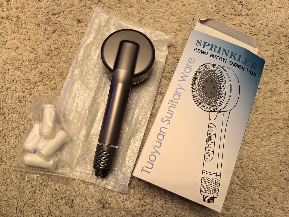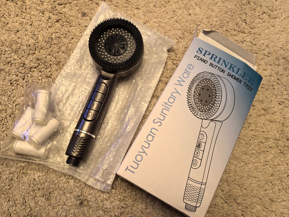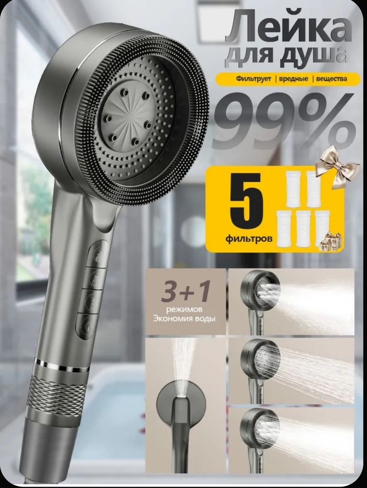 Лейка для душа с фильтрами. В использовании неделю примерно. Не зашла нам 😒 3 режима работы, кнопка остановки подачи воды. Есть небольшая потёртость. Экв 900