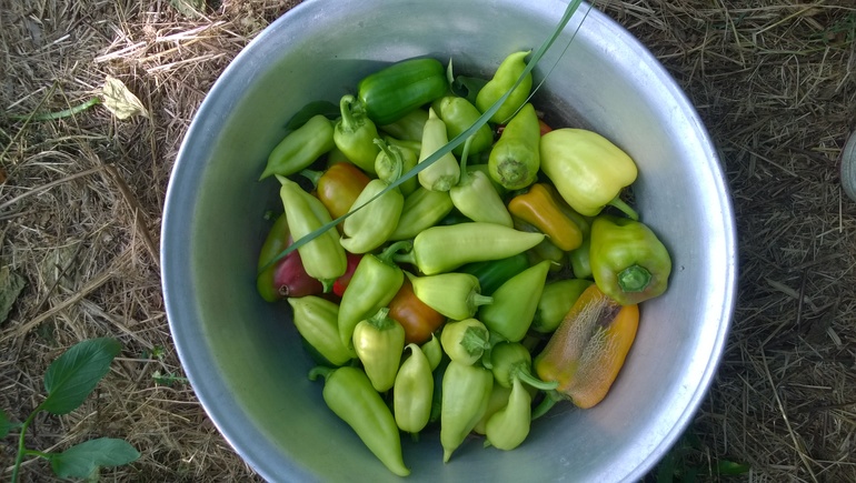 Мульчирование - это наше все! мне очень понравилось, что никакая мелкая травка не пробивается, а сильные сорняки, которые умудряются пробиться через толстый слой мульчи очень легко удалить, подсыпали скошенную траву раз в 3 недели, примерно. А еще не знаю заслуга это мульчирования или сезон был удачным, но фитофтора меня не посетила! вообще! листья начали чернеть в середине сентября! а последние помидорки зеленые я собрала 2 октября, до сих пор дозариваются дома, это 7 октября: собрала перчики последние