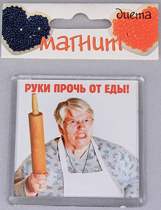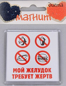Магниты "Руки прочь от еды", "Молодильные яблочки", "Желудок требует жертв" цена 15 р.Размер: 6,5x6,5