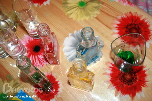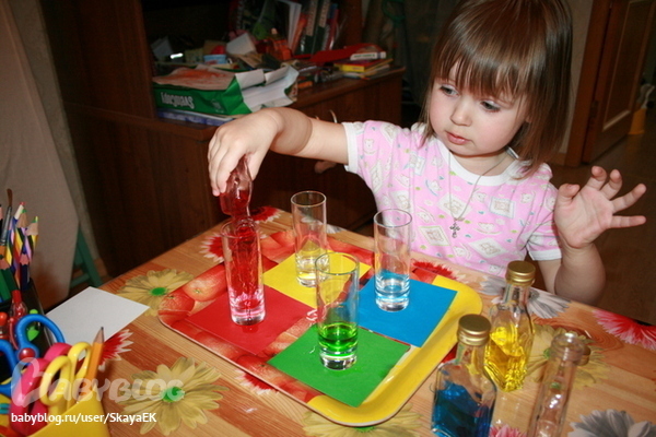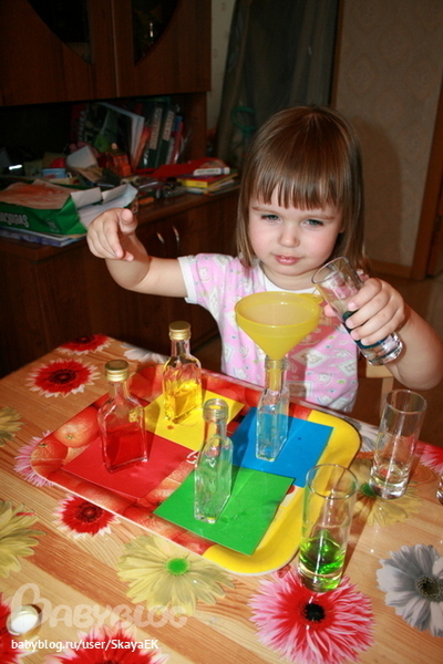 С Пасхи еще остались пищевые красители для яйц. Разводим их в воде в маленьких бутылочках (от сувенирного алкоголя остались). Подбираем соответствующее количество стопок (рюмок, чашечек). Стопки размещаем на цветных квадратах (из картона или бумаги). Далее задача проста: надо перелить цветную воду в стопку такого же цвета.