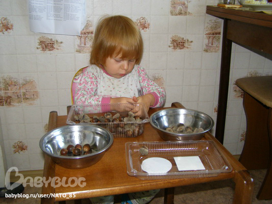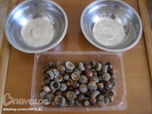 На днях, гуляя в парке, мы собрали немного желудей, причем они практически все были отдельно от своих шляпок! Лизик всегда очень переживает по этому поводу, и я решила помочь желудятам - приодеть их. Задание состояло из двух этапов. Сначала нужно было отсортировать желуди, шляпки и укомплектованные желуди (т.е. у которых уже имеется шляпка) по разным мисочкам. Затем нужно было подобрать желудятам головной убор.