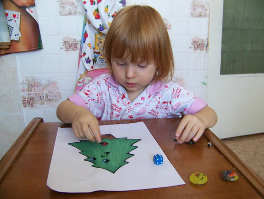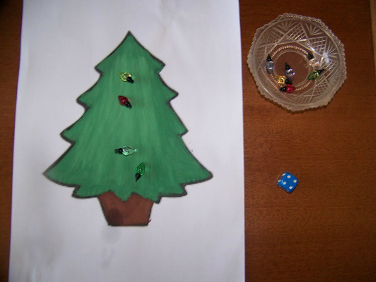 Снова елка, снова украшаем, но на сей раз лампочками. Количество лампочек определяет брошенный кубик, заодно и счет потренировали...