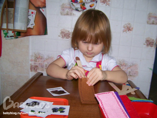 Следующее задание Лизе было не совсем понятно. Так как мой ребенок еще не совсем знаком с мороженным (лизнула 1 разок у мамы и все). А задача заключалась в следующем.. Нужно выбрать карточку с видом мороженного (вишневое, банановое и т.п.), затем ассоциативно подобрать палочку и само мороженое нужного цвета. Таким образом если выпало банановое мороженое. То нужно взять палочку с желтым кончиком и засунуть ее в желтый чехольчик…