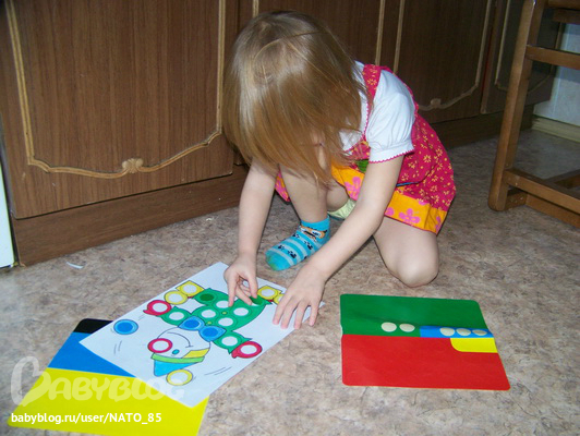 Задача Лизы заключалась в том, что нужно отклеить с листа самоклеющейся бумаги кружок нужно цвета и приклеить на картинку.