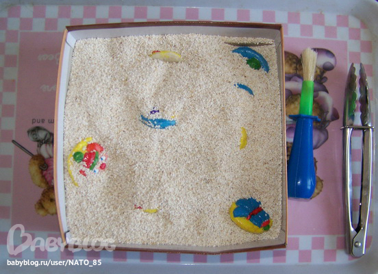 Но что же прячется в коробке? Для того чтобы это узнать нужно было сначала найти в крупе фигурки с помощью щеточки, а потом при помощи щипцов достать и рассмотреть!