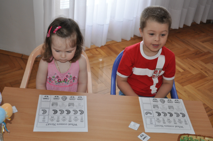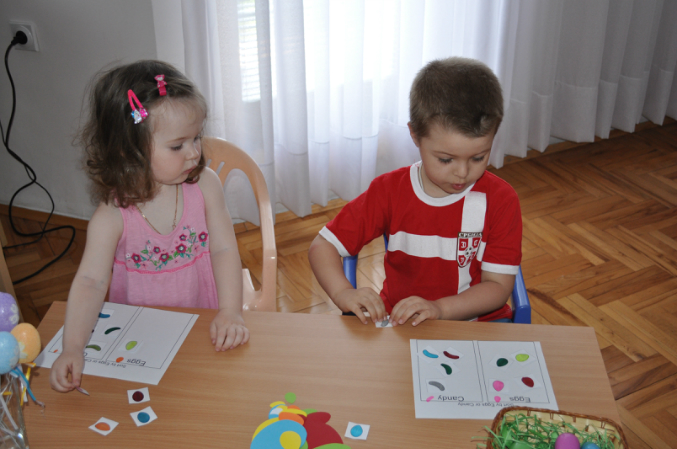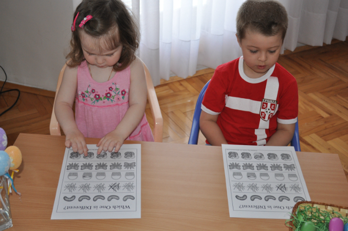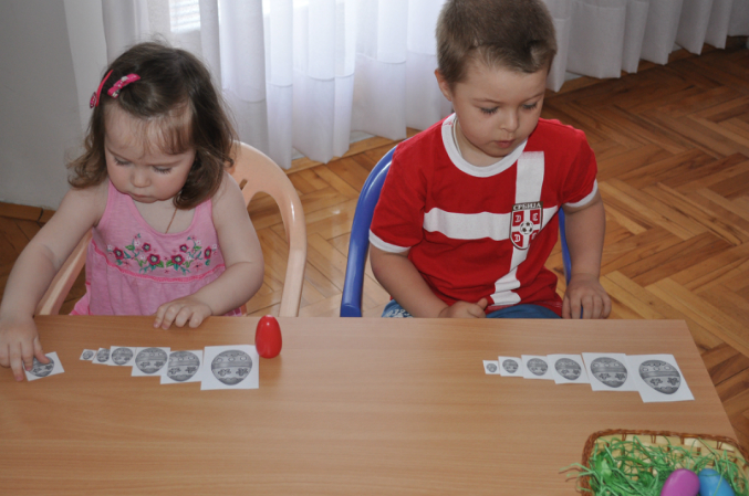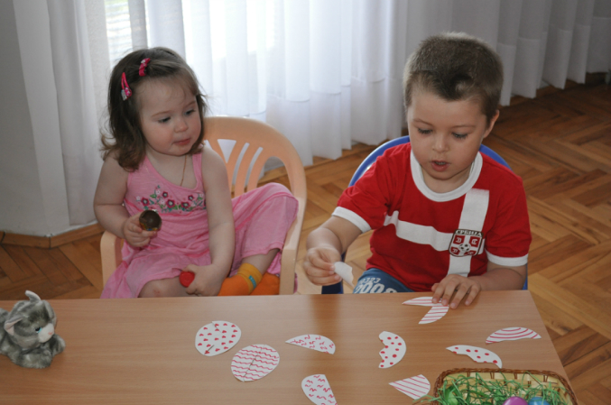Весело бегали друг за другом в поисках яиц, когда все яички были найдены, уселись находить одинаковые