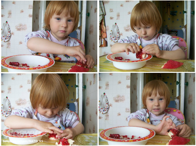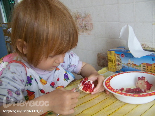 Захотелось маме чего-то вкусненького - в итоге ребенок чистил гранат, не самой же чистить))) Да еще мама наглость имела и дала для работы пинцет! Я думала она его сразу отбросит, так как Лиза Очень старалась быстрее маму накормить, а при сильном нажатии гранат брызгался... Но девочка моя очень упертая и в итоге зернышек 5-7 она таки вынула целыми с помощью пинцета, ну а дальше в ход пошли пальчики!