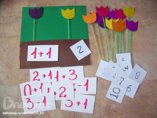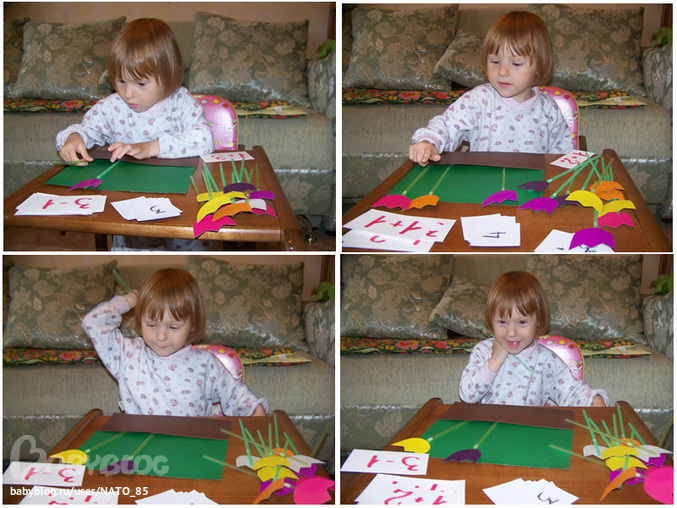 Задача проста - выбираем карточку с примером, разбираем вместе, а потом Лиза отсчитывает определенное количество цветочков и сажает на грядку, при этом досаживая или срезая определенное количество!