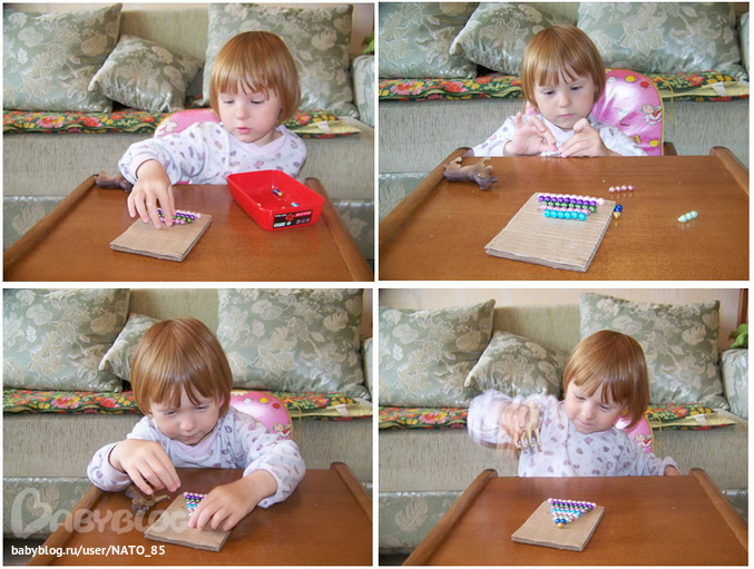 Практикуем счет и моторику с помощью самодельных счетных бусинок (о них отдельно уже писала - вот тут). Сначала задание выполнила Лиза, пользуясь рамкой.