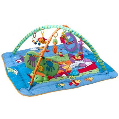 Я довольна: яркий, много всяких штук на самом коврике (шуршалки, пищалки), легко стирается и очень быстро сохнет. Миша любит шуршалки и пищалку (но сам еще не может ею пищать - довольно тугая) и две из 4 игрушки-подвески (льва и птичку-бубенчик). Платформа kick and play ему не нравится. Ее наличие никак не мотивирует его стучать ногами и руками: в настроении - барабанит и без нее, нет - никакая платформа не интересна. Может позже распробует... Любит зеркало.