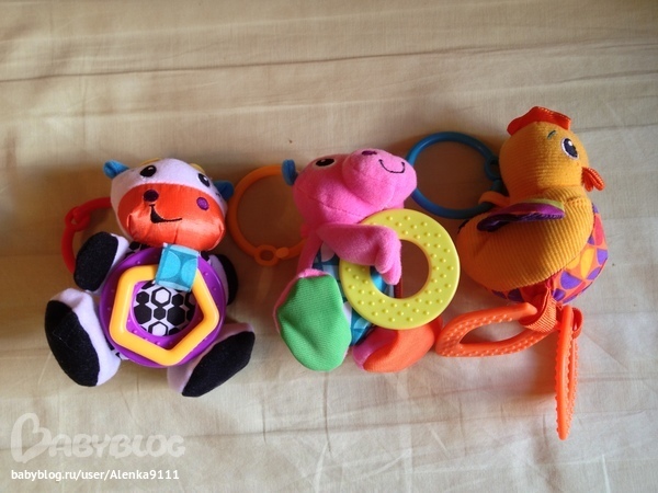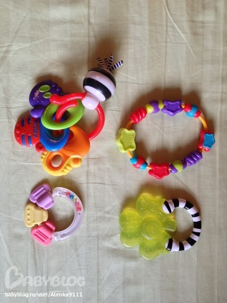 Два справа - Bright starts. Звездные бусы сейчас в фаворе. Ключики Nuby Мише не нравятся, да и мне тоже - тяжелые и громоздкие. Нижний левый - pigeon - очень хорош, как прорезыватель, легкий, мягкие резиновые лепестки ребенок грызет аж до скрипа. Как погремушка никакой - практически не слышен (позиционируется, как погремушка-прорезыватель).