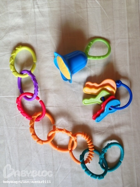 Синий колокольчик любит за звонкость. Колечки - вообще хит хитовый, чуть ли не любимая игрушка. Их больше вообще-то, около 20 штук.