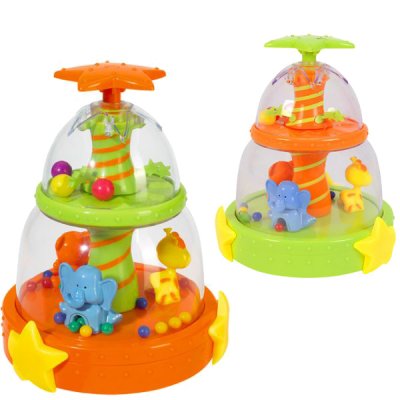 Обе игрушки Мишку очень увлекают. Конечно, пока он только таращится и слушает, сам ничего включить не может. Хотя по кнопкам сортера лупит иногда, случайным образом включая музыку. Про карусель могу сказать, что она немного быстровата, на мой взгляд. И динамик у нее почему-то снизу, так что если поставить на мягкое, ее не слышно. Кстати, регулятора громкости нет ни в одной из игрушек.