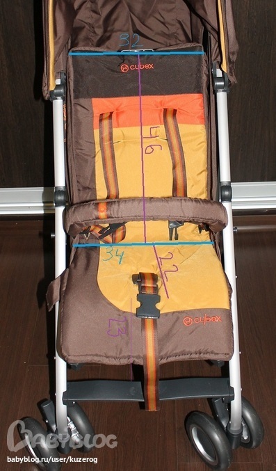 Высота спинки от сиденья - 46 см, ширина спинки - 32 см. Глубина сиденья - 22 см, ширина - 34 см (не знаю, как производители намерили 35??). Расстояние от сиденья до подножки около 23 см.