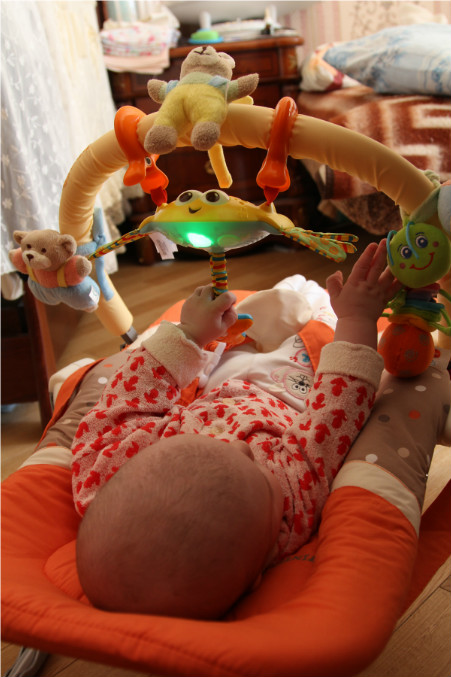 Ребенок быстро понимает, что когда ножками двигает вверх вниз (стучит по бортам люльки носочками), шарики в круглешке у обезьянки шатаются -гремят . Ребенок визжит от восторга, что он на что-то влияет)))