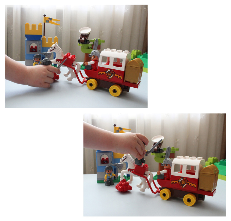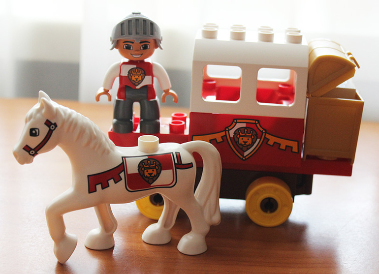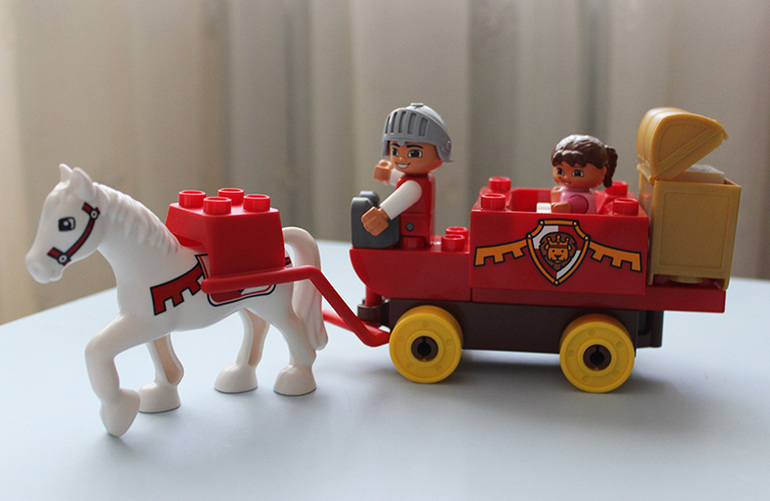 Лошадку можно использовать, отдельно от повозки, рыцарь (и не только) крепятся легко и надежно. Я уже выше писала, что Саша первым делом (когда первый раз открыли коробку) усадил рыцаря в седло)))