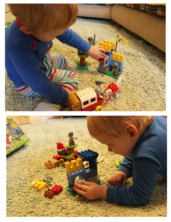 Ну, а пока я готовила Саше обед, он сам что-то там придумывал и по-своему играл. Набор увлек его конкретно, что даже пришлось кормить обедом не только Сашу, но и всех рыцарей ))) Кстати и спать они легли все вместе. А проснувшись, первым делом услышала: игать-игать-игать! (т.е. играть). И это, пожалуй, высшая оценка этому набору!
