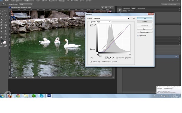 Как и Levels, инструмент Curves используется для управления контрастом и цветами, поэтому, естественно, он также привязан к гистограмме, однако, не включает её в своё диалоговое окно. Поэтому для большей иллюстративности гистограмму можно включить в специальной палитре на рабочем столе.