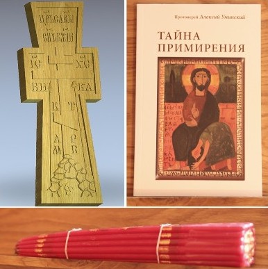 2 место - книга прот. Алексея Уминского "Тайна примирения", резной крест из дуба и 33 пасхальные иерусалимские свечи