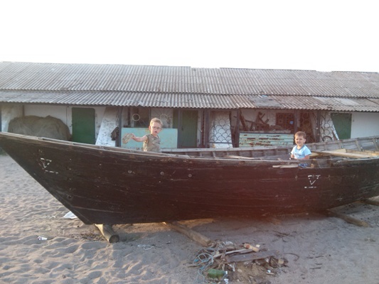 Осмотрелись увидели еще старую моторную лодку залезли и в нее, а там нашли бананы и маркеры.