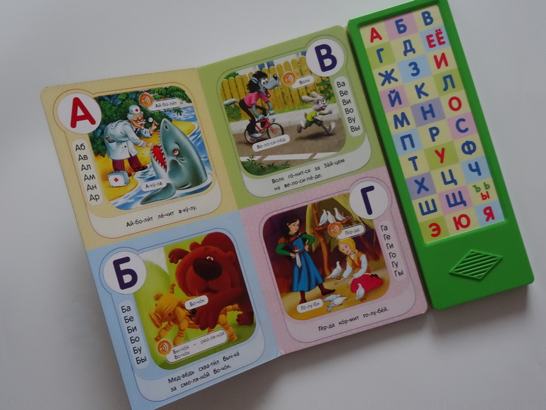 К говорящим азбукам я очень настороженно отношусь. Боюсь как бы это все не вылилось в "эмаэма" вместо "мама". Поэтому выбрала вот такой вариант. Тут произносится именно звук, иллюстрации не устрашающие. Говорит о узнаваемости не буду, так как мультики мы не смотрим.