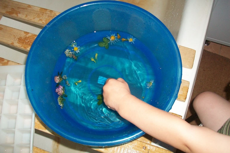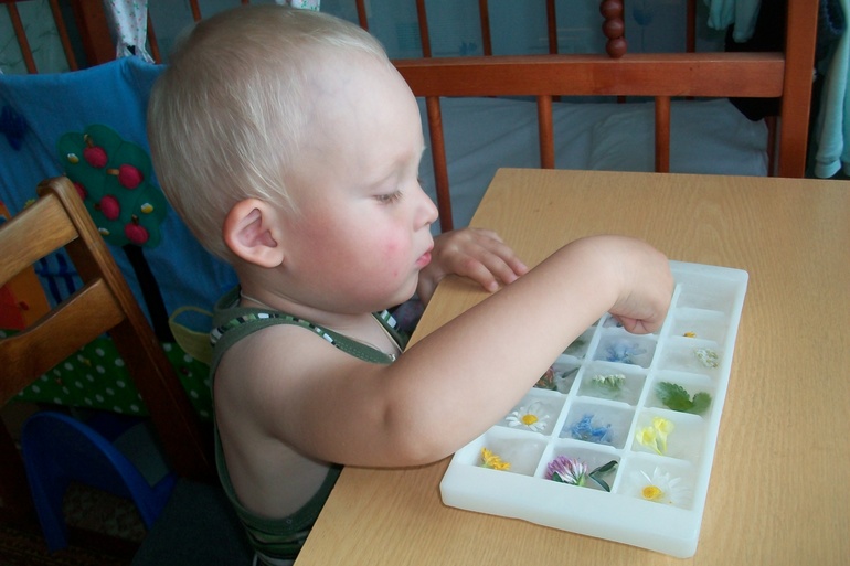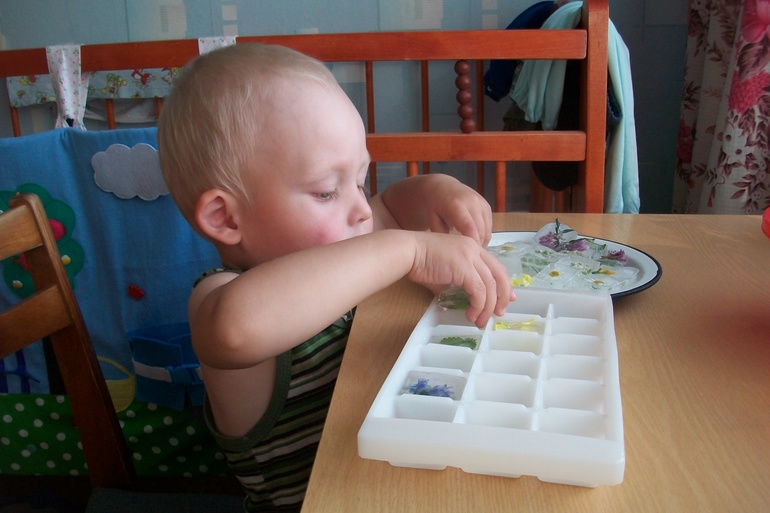 Изучаем окружающий мир (тематические занятия и циклы занятий)Вот и пролетело лето. Совсем как-то незаметно. В один из последних теплых деньков решили мы поиграть с цветочками и льдом. Насобирали на улице разных цветов и принесли домой. Достали форму из-под льда и сложили туда все цветочки