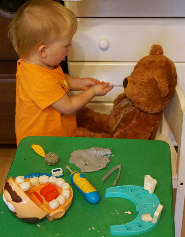 Развитие детей второго года жизниМы давно с Машей освоили аптечку, а игра в доктора была одной из самых любимых больше месяца, и вот я случайно наткнулась на набор стоматолога от Play-Doh. на мой взгляд, их комплекты про мороженое-пирожное вполне воспроизводимы и в домашних условиях, а вот этот чудо-пациент мне пришелся по душе. успех игры оценивается тем. как часто и как долго ребенок готов в нее играть. Целую неделю у нас это хит с утра и до ночи. мы лепим зубы, ставим пломбы, бор-машина жужжит, а язык прикольно высовывается. Одним словом, экстаз! Рекомендую, словарный запас обогатить, да и время провести с пользой. Теперь у нас появился живой интерес к чистке зубов!